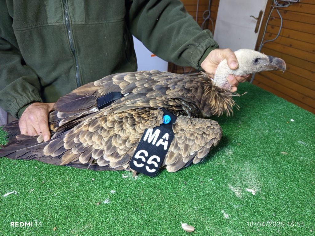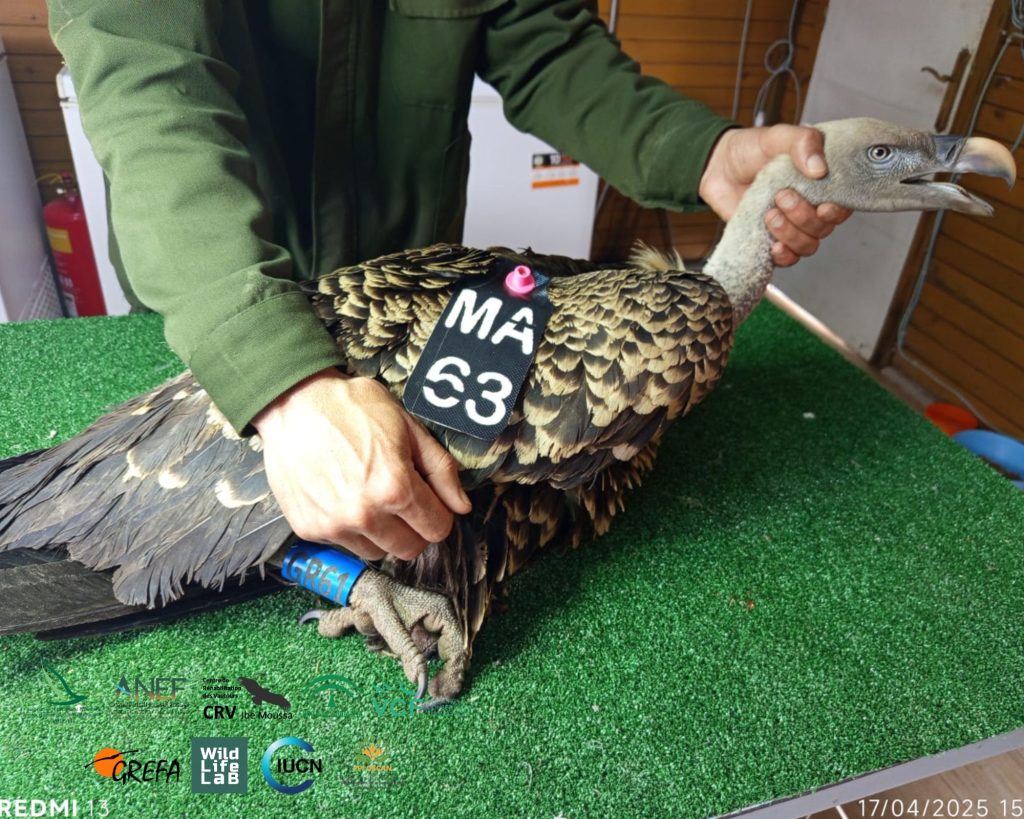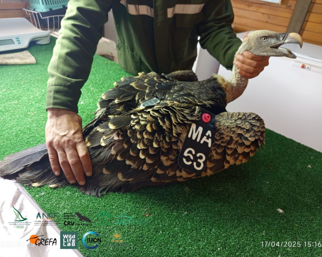 Le 17/04/2025, un Vautour de Rüppell adulte a été capturé et marqué avec des tags alaires (MA63), une bague en PVC, et équipé d’un GPS offert par la Junta de Andalucía (d’un totat de 10 GPS), marquant le premier individu de cette espèce observé, capturé et marqué pour la saison 2025 au CRV Jbel Moussa.