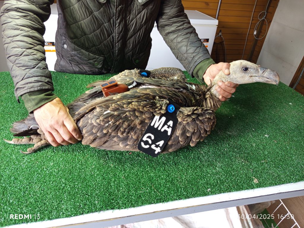 Le 30 avril, un troisième Vautour de Rüppell immature a été capturé, marqué avec des tags alaires (MA64) et équipé d’une balise GPS fournie par la Vulture Conservation Foundation (VCF) (d’un total de 4 Gps) avant d’être relâché.