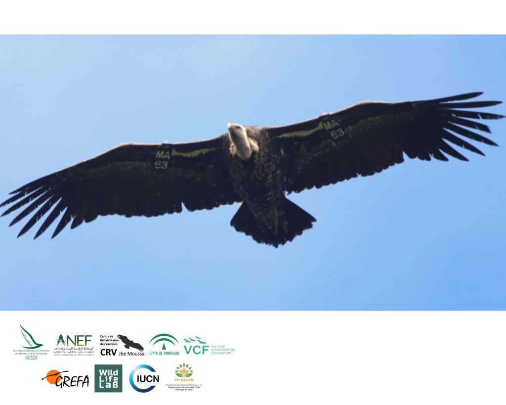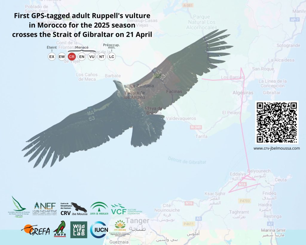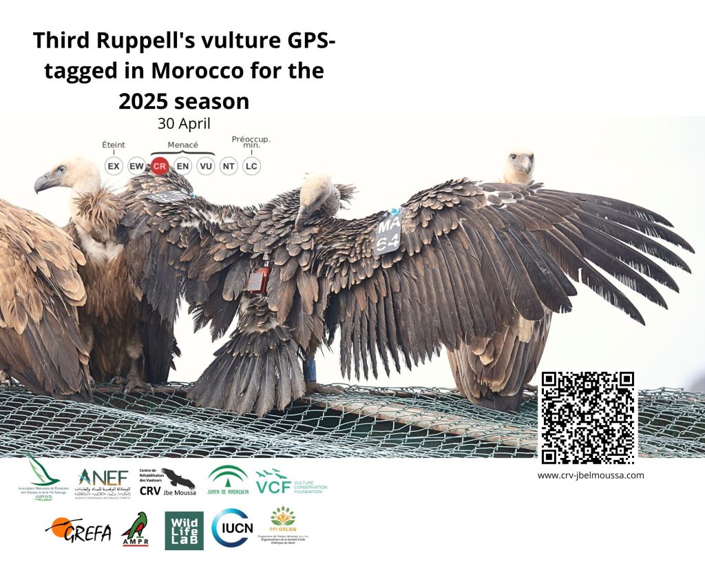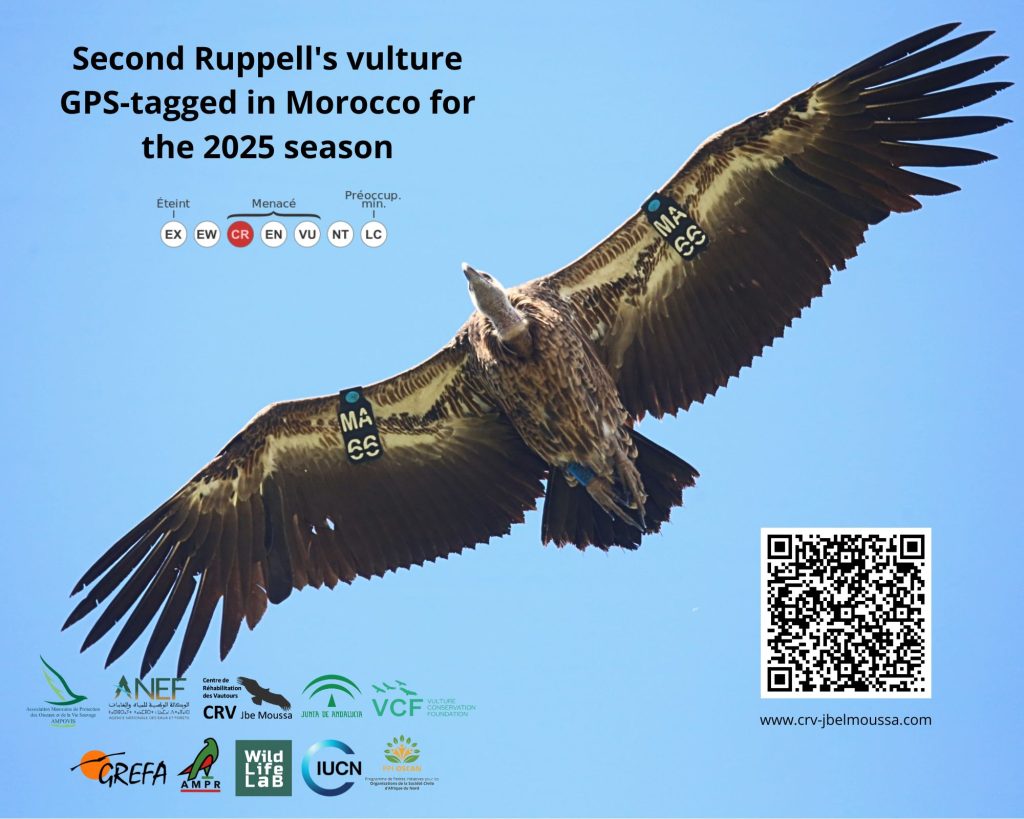 La campagne de marquage et de suivi des Vautours de Rüppell en 2025, menée par l’AMPOVIS en partenariat avec l’ANEF au CRV Jbel Moussa, compte avec la participation de la Junta de Andalucía, VCF, GREFA, AMPR, Wildlife-Lab, avec le soutien de l’UICN-Med et du Programme PPIOSCAN3.
